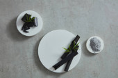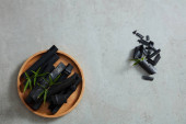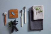 Widok z góry na aktywowaną miskę z węglem drzewnym, dwie tacki czarnego bambusa i szczoteczkę do zębów z ręcznikiem umieszczonym na drewnianej tacy w środku