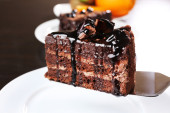 Smaczny sztuk ciasto czekoladowe z mięty na drewnianym stole tło