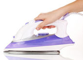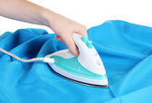 Ręka prasowanie odzieży na deskę do prasowania, zbliżenie
