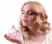 piękna młoda kobieta z butelki perfum na czarnym tle
