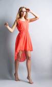 Piękna młoda kobieta w sukni koloru pozowanie na jasnym tle
