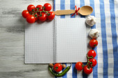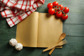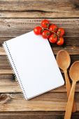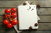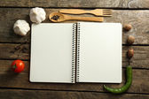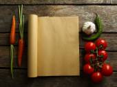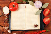 Otwórz książkę kucharską z świeżych ziół, pomidory i przyprawy na drewniane tła