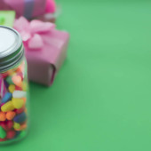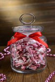 kolorowe cukierki w słoiku na stole na drewniane tła