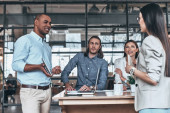 Zdjęcie "Grupa profesjonalistów zaangażowanych w ożywioną dyskusję i burzę mózgów wokół stołu w biurze." może być wykorzystywane do celów osobistych i komercyjnych zgodnie z warunkami zakupionej licencji Royalty-free. Obraz jest dostępny do pobrania w jakości wysokiej rozdzielczości do 5760x3840.