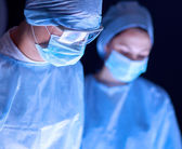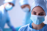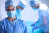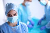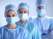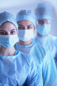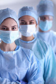 Zespół chirurgów w mundurach ochronnych, czapkach i maskach