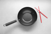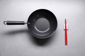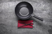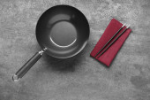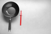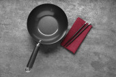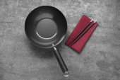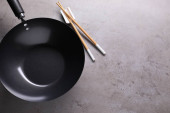 Pusty wok żelazny, miska sosu i pałeczki na czarnym stole, płaski leżak