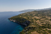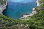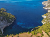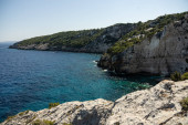 Plaża Porto Limnionas Zakynthos Grecja. Aerial drone View Of Porto Limnionas Plaża w Zakynthos Wyspa Grecja. wakacje turkusowe morze i zielone skaliste klify na wyspie.