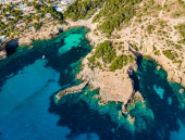 Plaża Porto Limnionas Zakynthos Grecja. Aerial drone View Of Porto Limnionas Plaża w Zakynthos Wyspa Grecja. wakacje turkusowe morze i zielone skaliste klify na wyspie.
