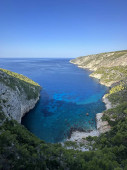 Plaża Porto Limnionas Zakynthos Grecja. Aerial drone View Of Porto Limnionas Plaża w Zakynthos Wyspa Grecja. wakacje turkusowe morze i zielone skaliste klify na wyspie.