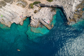 Plaża Porto Limnionas Zakynthos Grecja. Aerial drone View Of Porto Limnionas Plaża w Zakynthos Wyspa Grecja. wakacje turkusowe morze i zielone skaliste klify na wyspie.
