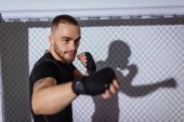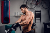 Przystojny mężczyzna z brodą w rękawiczkach bokserskich, walący torbę w siłowni..