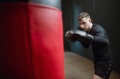Przystojny mężczyzna z brodą w czarnej koszulce i rękawicami bokserskimi rzucający ciosy w worek treningowy w siłowni.