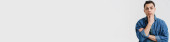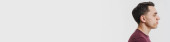 Przystojny Azjata w białej bluzce zbiornika wykonuje pewną pozę w szarym studio.
