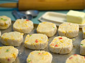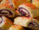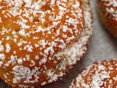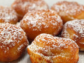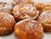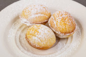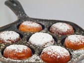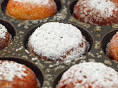 pan z świeżo gotowanych aebelskivers cukrem pudrem