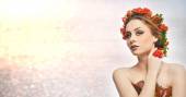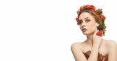 Portret piękne dziewczyny w studio z żółtymi i czerwonymi różami w jej włosy i nagie ramiona. Sexy młoda kobieta z profesjonalnym makijażu i jasnych kwiatów. Kreatywnych fryzurę i makijaż, łapka