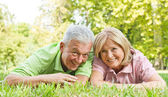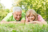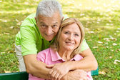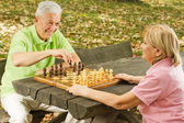 szczęśliwa para starszy, gra w szachy na ławce w parku