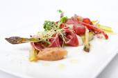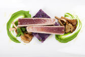 Filet z tuńczyka z boczniakami, puree z groszku i ziemniaków