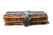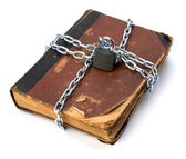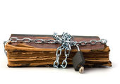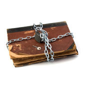 postrzępione książki z łańcuch i kłódkę na białym tle na biały deseń
