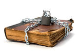 postrzępione książki z łańcuch i kłódkę na białym tle na biały deseń