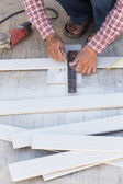 cieśla rąk za pomocą elektrycznych zobaczył na drewno w budowie