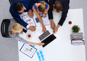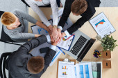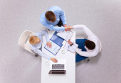 Biznesmeni siedzący i dyskutujący na spotkaniu biznesowym, w biurze
