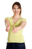 młoda kobieta Wyświetlono ok, na białym tle na białym tle
