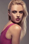 oung Blond kobieta sobie fioletowy koronki biustonosz