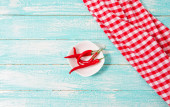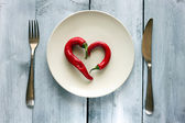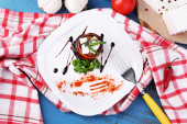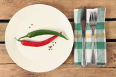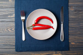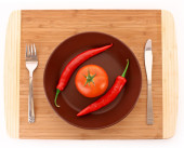 Słowo dieta wykonane w plasterkach warzywa w białe płytki na drewnianym stole, widok z góry