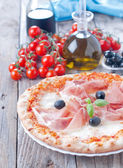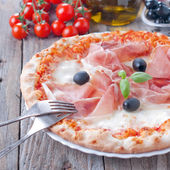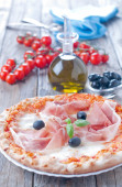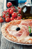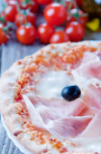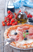 Zdjęcie "Pizza z szynką i pomidorami, butelka oleju" może być wykorzystywane do celów osobistych i komercyjnych zgodnie z warunkami zakupionej licencji Royalty-free. Obraz jest dostępny do pobrania w jakości wysokiej rozdzielczości do 5760x3840.