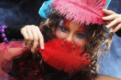Modelka z kreatywnych makijaż dmuchanie baniek mydlanych.