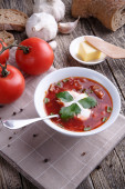 Smaczne zupy z chlebem na tle drewniane.