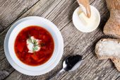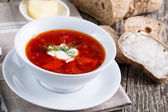 Smaczne zupy z chlebem na tle drewniane.