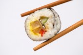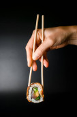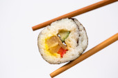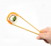 Ręka trzyma Sushi roll pałeczkami bambusa na białym tle