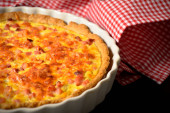 Quiche z pomidorkami i zioła na białym talerzu