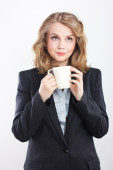 Piękna blondynka z mają coffe break. Biznes kobieta. Zamknięty w porze lunchu. Tea party. Na białym tle. Portret pięknej blondynce