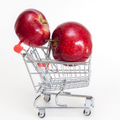 Duże czerwone śliwki w koszyku sklepu