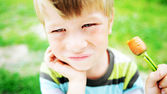 Happy wiosna ogrodnictwo chłopiec z sadzonki i narzędzia na białym tle.