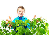 Happy wiosna ogrodnictwo chłopiec z sadzonki i narzędzia na białym tle.