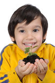 Happy wiosna ogrodnictwo chłopiec z sadzonki i narzędzia na białym tle.