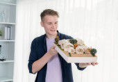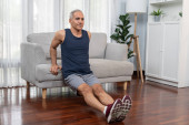 Szczęśliwy ojciec przenieść się do muzyki podczas gotowania żywności i przygotować obiad w nowoczesnej kuchni. Aktywny tata tańczy do piosenki, robiąc zdrowe jedzenie lub sałatkę otoczoną warzywami i przyborami kuchennymi. Pedagogika.