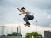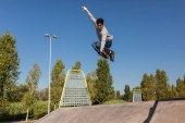 Zdjęcie "Młody łyżwiarz pewnie jeździ na deskorolce po rampie w skateparku w słoneczny dzień.." może być wykorzystywane do celów osobistych i komercyjnych zgodnie z warunkami zakupionej licencji Royalty-free. Obraz jest dostępny do pobrania w jakości wysokiej rozdzielczości do 5760x3840.