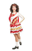 Młoda kobieta w strój czerwony i biały tańca irlandzkiego i peruce pozowanie