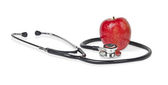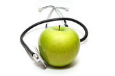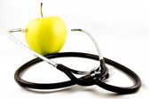 Medical stethoscope with green apple isolated on white background. Concept for diet, healthcare, nutrition or medical insurance.