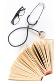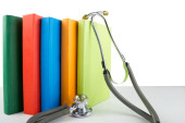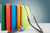 Medical stethoscope and stack of books. Medical professional education and information concept.