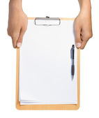 Female hand holding a pen and clipboard with blank paper (document, report) isolated on white background. Top view.