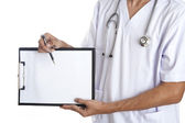 Female Doctor's hand holding a pen and clipboard with blank paper (document, report) and stethoscope isolated on white background. Concept of Healthcare And Medicine. Copy space.