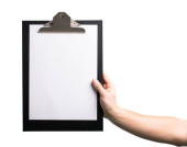 Female hands holding medical clipboard with blank sheet of paper isolated on white background. Copy space.