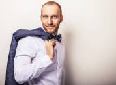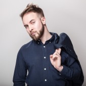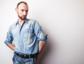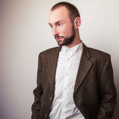 Elegancki młody przystojny mężczyzna w jasny kolorowy koszula. Studio moda piękny portret.