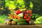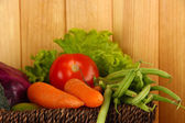 Różne warzywa (marchew, ziemniaki, kapusta, pomidory) w koszyku