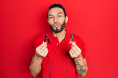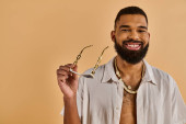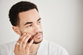 Afroamerykanin atrakcyjny młody mężczyzna z brodą trzymający butelkę serum.